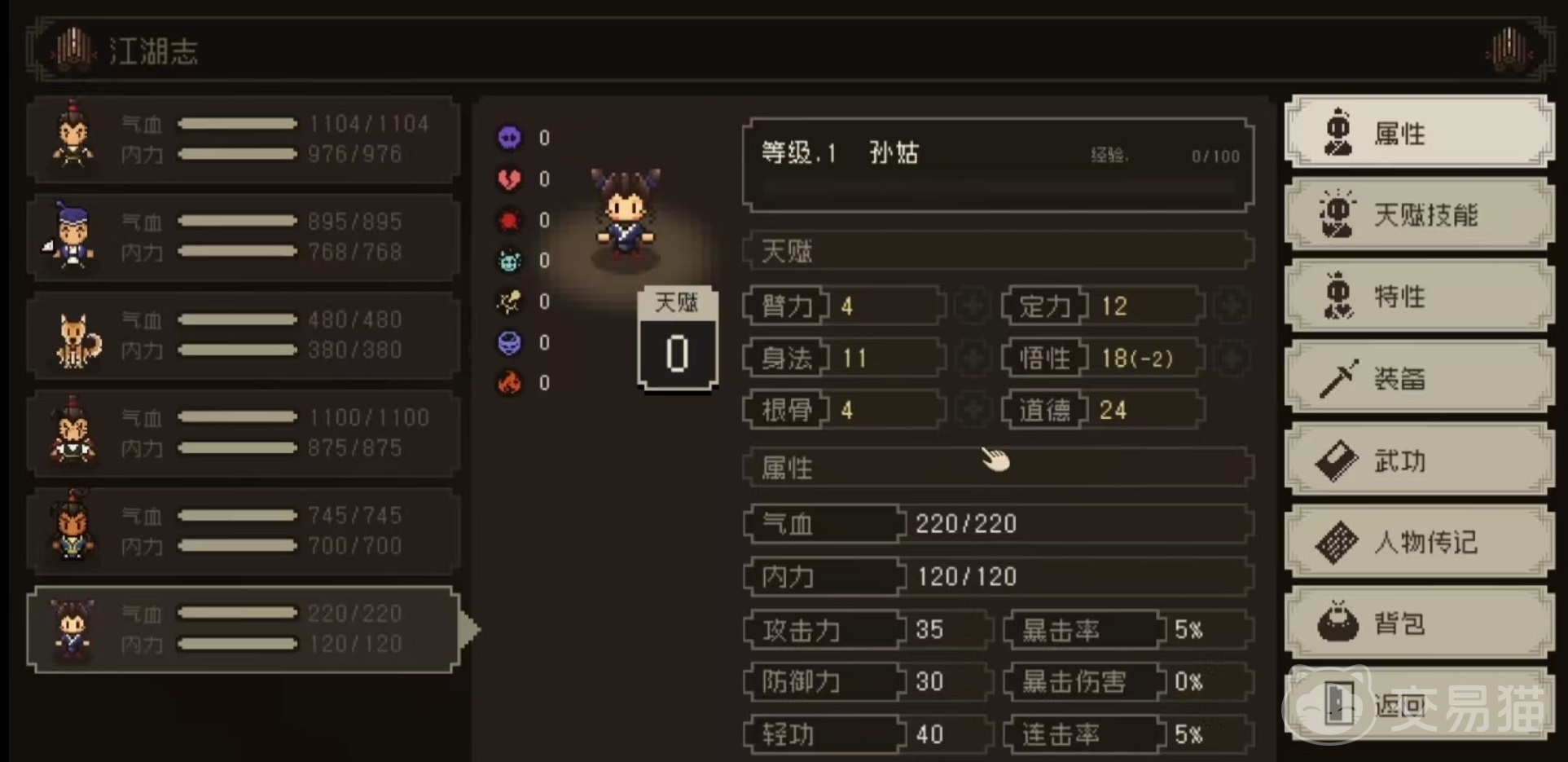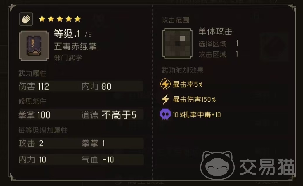 孙姑属性方面医术和酒艺还是很不错的,具有两个天赋,分别是问题儿童和童子身。问题儿童使得获得经验值额外+50%,自身轻功-5%。童子身属性是轻功+5%,暴击+5%,连击+5%,悟性-2。天赋方面或许并不突出,但是它自带的武功却很有特点,是五毒赤练掌和百珍食谱。五毒赤练掌是属于邪门武学,伤害112,内力80,单体攻击类型,暴击率5%,暴击伤害150%,有10%的几率中毒加10。
