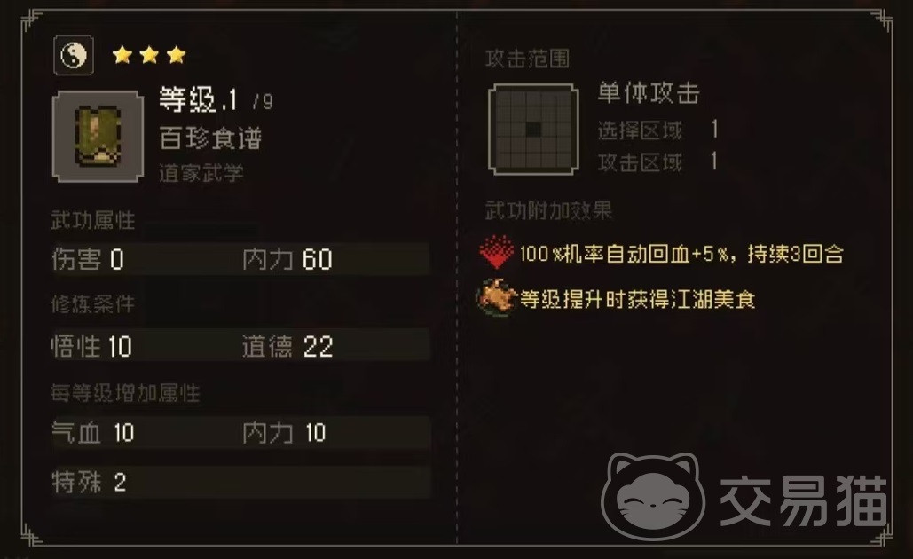 其实这些都不算最重要,关键在于所携带的百珍食谱。这是一个非常特殊的武学,没有伤害,但是附加百分之百几率自动回血加5%,持续三个回合,等级提升时获得江湖美食。只要大家在探险的过程中带上孙姑,那么升级之后就能够获得美食。这些美食吃下去之后能够获得各种增益状态,帮助大家战斗。