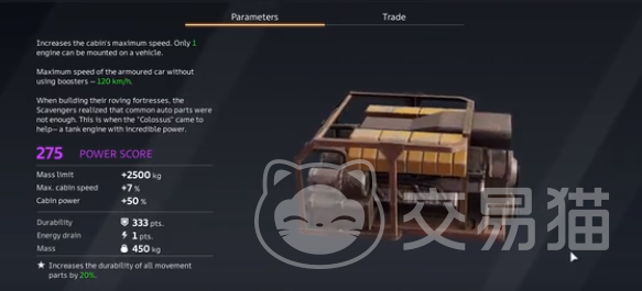 大功率引擎-2型:这是很多拾荒者阵营首选的引擎,一旦拾荒者证明,等级超过7级时,此时就可以搜刮营地,然后去制作史诗级部件。被动的效果是有效提升20%的武器装填cd,也就意味着可以提升到蛋类战车,还有火炮类战车的性能。