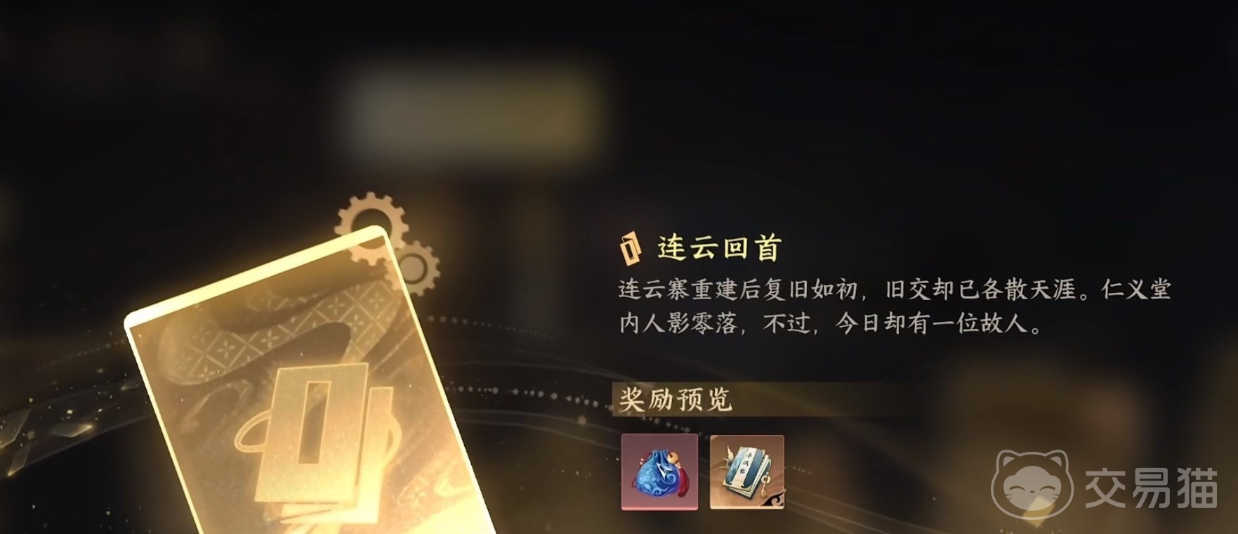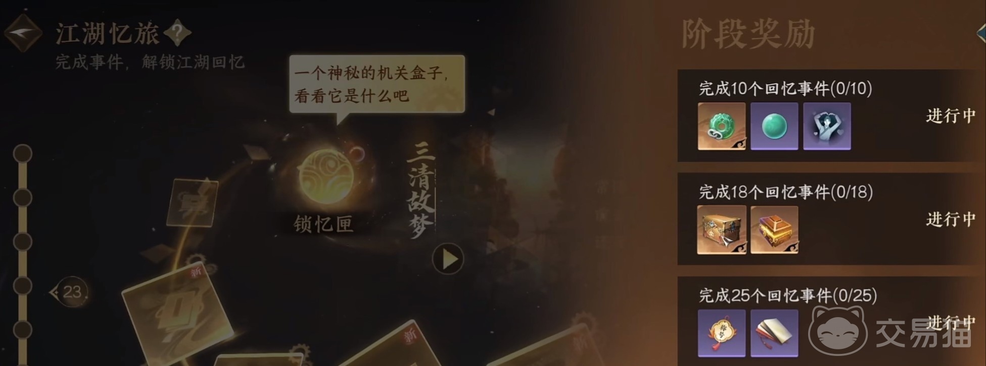 点击进入到江湖忆旅中以后,你会看到在这里有着很多等着你去完成的任务,这些任务全部都是以带有不同图案的金色卡片出现在你眼前的,在每个金色的卡片背后都隐藏着不一样的任务,想要查看任务的具体内容的话就需要玩家点击金色卡片就行了,在金色卡片中,我们可以发现有着卡片是带有蝴蝶的标志,有着卡片则是宝箱以及帖子的标志,这些不同的标志也意味着我们完成任务以后获得的奖励也是不同的,蝴蝶代表的是千机珠、帖子代表的是交子、宝箱则就好认了代表的就是宝箱。