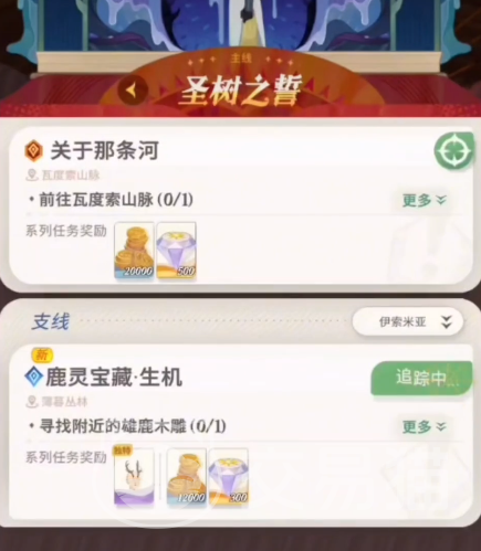 游戏里这些任务都是相互关联的,而且薄暮丛林5是一个隐藏的岛屿状态,没有办法直接进入,想进入的玩家需要先解锁薄暮丛林7,可以通过地图传送到岛屿的最下方,沿着旁边的木桥可以到达附近的小岛,在这里有一个鹿角任务,这时候可以打开任务栏能查看到新增了一个鹿灵宝藏的任务,这时候需要根据指引先来到薄暮丛林3,在这里有一个荧月湖,沿着这里的道路一直向前,可以看到开放了一个隐藏的道路,沿着这个道路可以到达岛屿上完成鹿角任务。