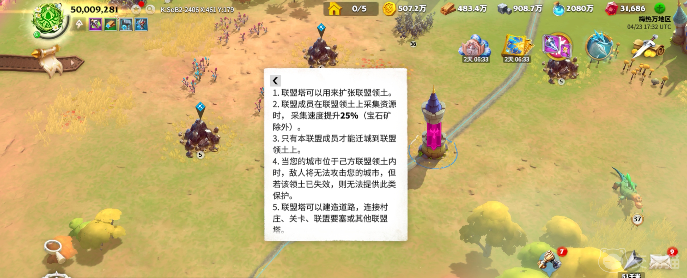 联盟要塞的功能多种多样,不仅拥有较高的耐久值,能够抵御敌人的攻击,还能为联盟成员提供诸多便利。当联盟成员在领土内的资源点采集时,采集速度将提升25%,但是需要注意宝石矿除外,极大地提高了资源获取效率。同时,联盟成员在迁城到联盟领土上后,城市将受到领土的保护,免受其他玩家的攻击。此外,解锁特定联盟科技后,还能将联盟塔升级为联盟攻城塔,自动攻击附近范围内的其他玩家城市,进一步巩固联盟防线。