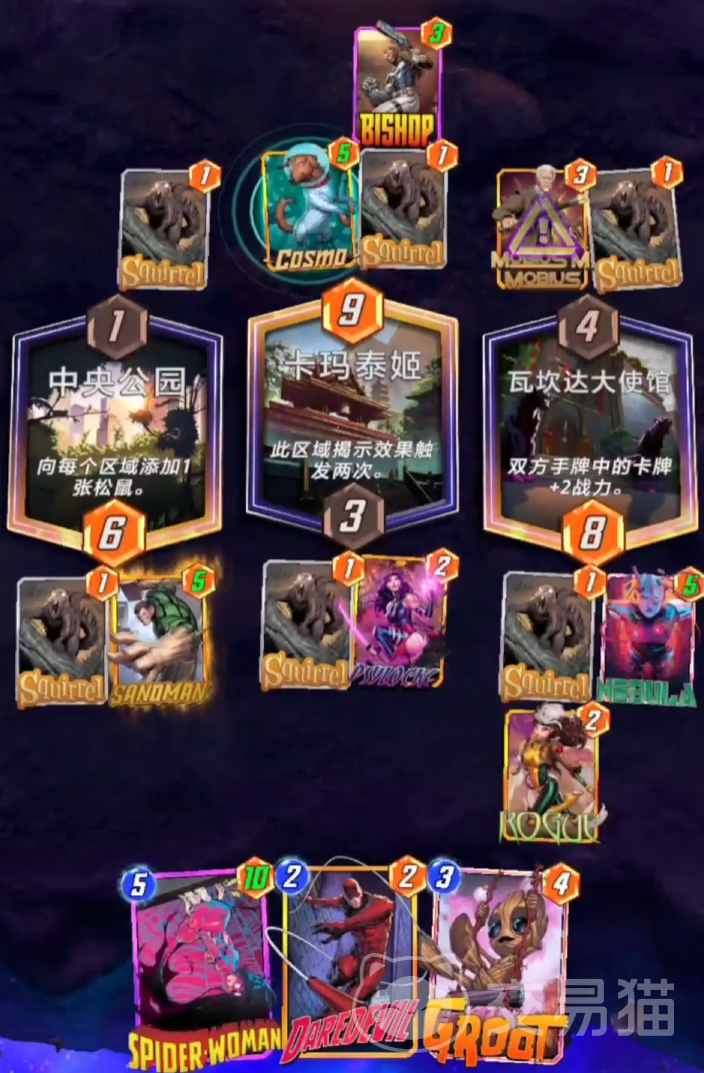 惊奇队长这个牌要在倒数第三个回合放在场上,她的作用是在游戏结束时移动到会赢的区域,比如二号区域本来结束时比对方少一点,惊奇队长就会自动移动过去来保证此区域获胜,这是一个保险,而沙人要在倒数第二个回合放,目的就是让敌人最后一回合只能出一张卡,这时候对手就会放出能影响一个战区胜利的高战卡牌,大家的小计谋也就可以实现了。