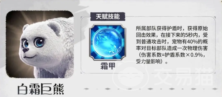 游戏中的巨兽 一般称之为白霜巨熊,这个宠物比较适用于步兵阵容,由于其技能可以提供反伤技能,对于步兵需要持续吃伤害的阵容加成还是很不错的。