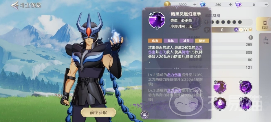 暗黑凤凰的必杀技,暗黑凤凰幻魔拳,不仅能够对最近的敌人造成巨大的单体伤害,最高可达到300%的念力伤害,还能击飞敌人并使其倒地1.5秒,同时降低敌人的念力防御力30%,持续10秒,这一技能的高强度输出和控制效果,使其成为破解敌方阵容的关键,在面对强大的单个敌人时,合理使用这一技能可以迅速改变整体的情况。