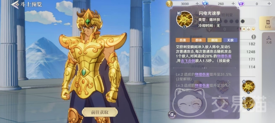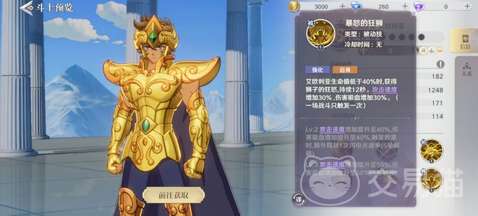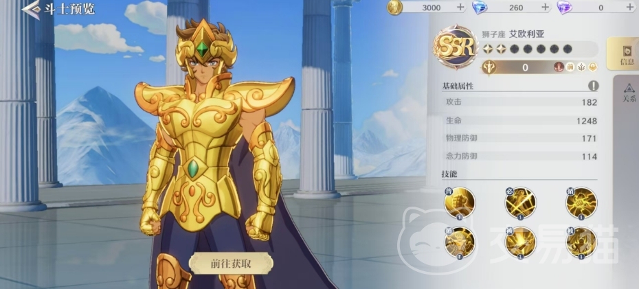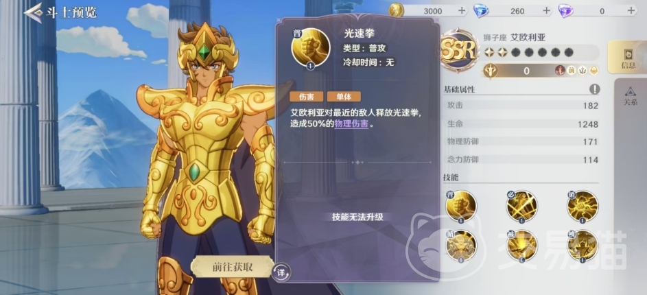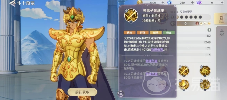 艾欧利亚,作为游戏中的SSR品质狮子座斗士,他的各项技能不仅适合前排的战斗布局,还拥有出色的生存能力和群体输出能力,艾欧利亚的基础生命值高达1248,这使得他在战斗中拥有较高的生存能力,艾欧利亚的普攻技能“光速拳”能对最近的敌人造成50%的物理伤害,这种快速而强力的攻击方式非常适合开场使用。