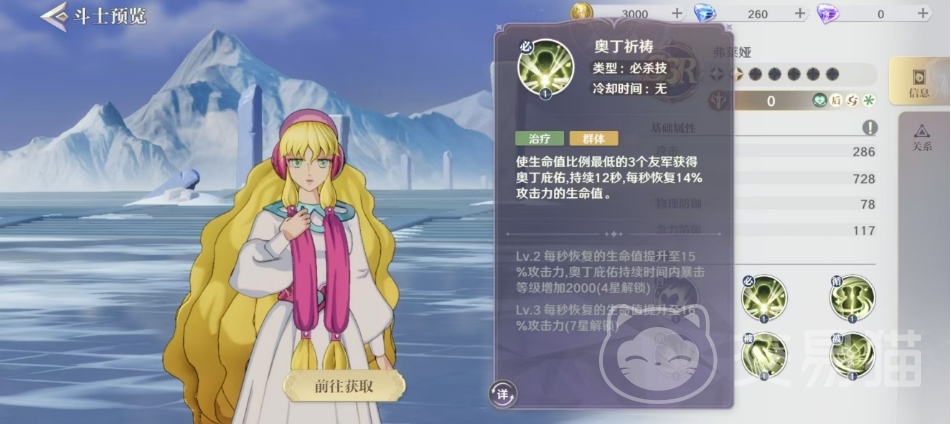 她的必杀技“奥丁祈祷”是一个强大的群体治疗技能。它能够使生命值比例最低的三个友军获得奥丁的庇佑,持续12秒,每秒恢复一定比例攻击力的生命值,随着技能等级的提升,每秒恢复的生命值和暴击等级也会相应增加,这使得弗莱娅在持久战中显得尤为重要,技能提升到Lv.2时每秒恢复的生命值提升至15%攻击力,奥丁庇佑持续时间内暴击等级增加2000,Lv.3时每秒恢复的生命值提升至16%攻击力。