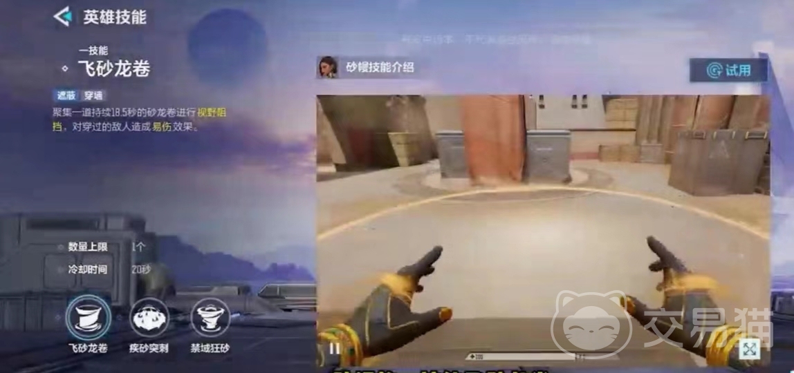 a.效果:这是一个遮蔽穿墙的技能,能够聚集起一道可以持续18.5秒的砂龙卷。这个砂龙卷可以阻挡敌人的视野,并对穿过的敌人造成易伤效果。除了易伤,技能本身的战略作用也非常明显,是一个攻守兼备的技能。