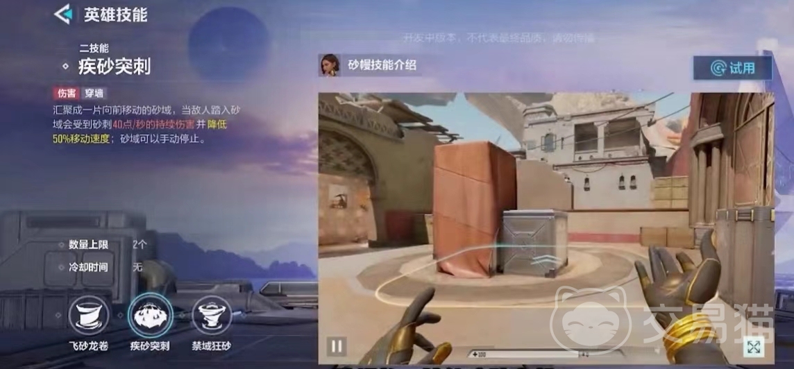 a.效果:砂幔可以汇聚一片向前移动的区域,当敌人踏入这个区域内时,会每秒都遭受到来自砂刺的持续伤害,并且还会受到减速效果。疾砂突刺的速度其实并不快,但这个技能对于敌方站好点位的人来说非常克制,可以让对方被迫远离优势枪位,而且这个砂域是可以自行手动停止的,所以这个技能在进攻和防守中都是一个非常有优势的技能。