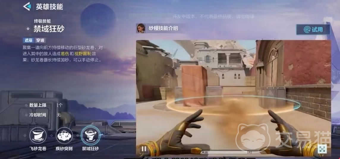 a.效果:砂幔可以聚集一道能够向前面持续移动的巨型砂龙卷,进入其中的敌人都有可能遭受易伤以及视野限制的效果。这个砂龙卷会自动持续存在一段时间,也可以手动进行停止。