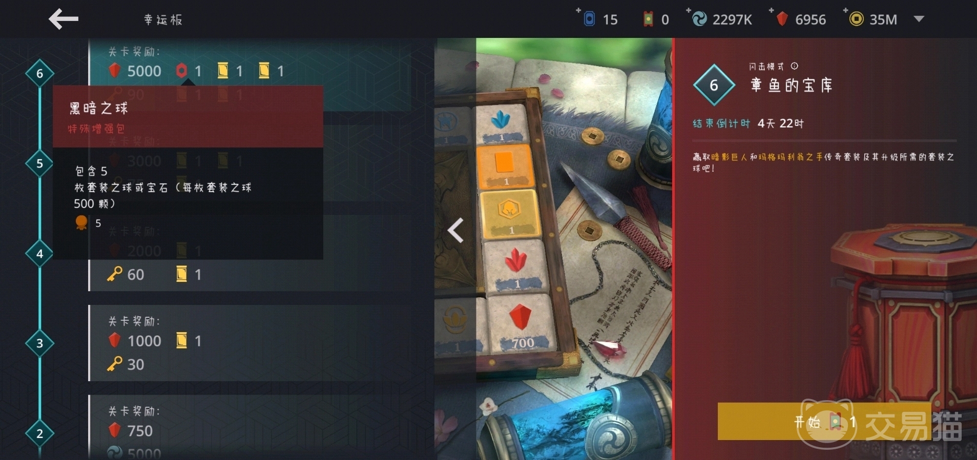 左侧的关卡奖励中分数越高越丰富,比如提示玩家可以获得3000钻石以及三个传奇套装卡套还有传奇宝箱宝石等等,这种奖励都不是立刻到账的,而是在一个星期的活动时间结束之后登入游戏之后自动发放给玩家,抽到第五关返还3000钻石的话,运气好的玩家可能也就总共消耗了两三千钻石,所以说章鱼的八宝库是新玩家获得远古套装很好的活动。