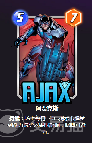 阿贾克斯的效果是持续,场上每有1张已揭示卡牌,受到战力减少效果的影响,那么此牌+1战力。很多玩家之所以认为阿贾克斯看起来比较弱,是因为一张新出的卡牌在当前环境中要找到合适的卡组融入进去,才能打出很好的数据,所以大多数情况都是因为用错了地方。