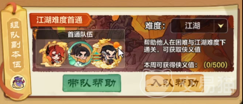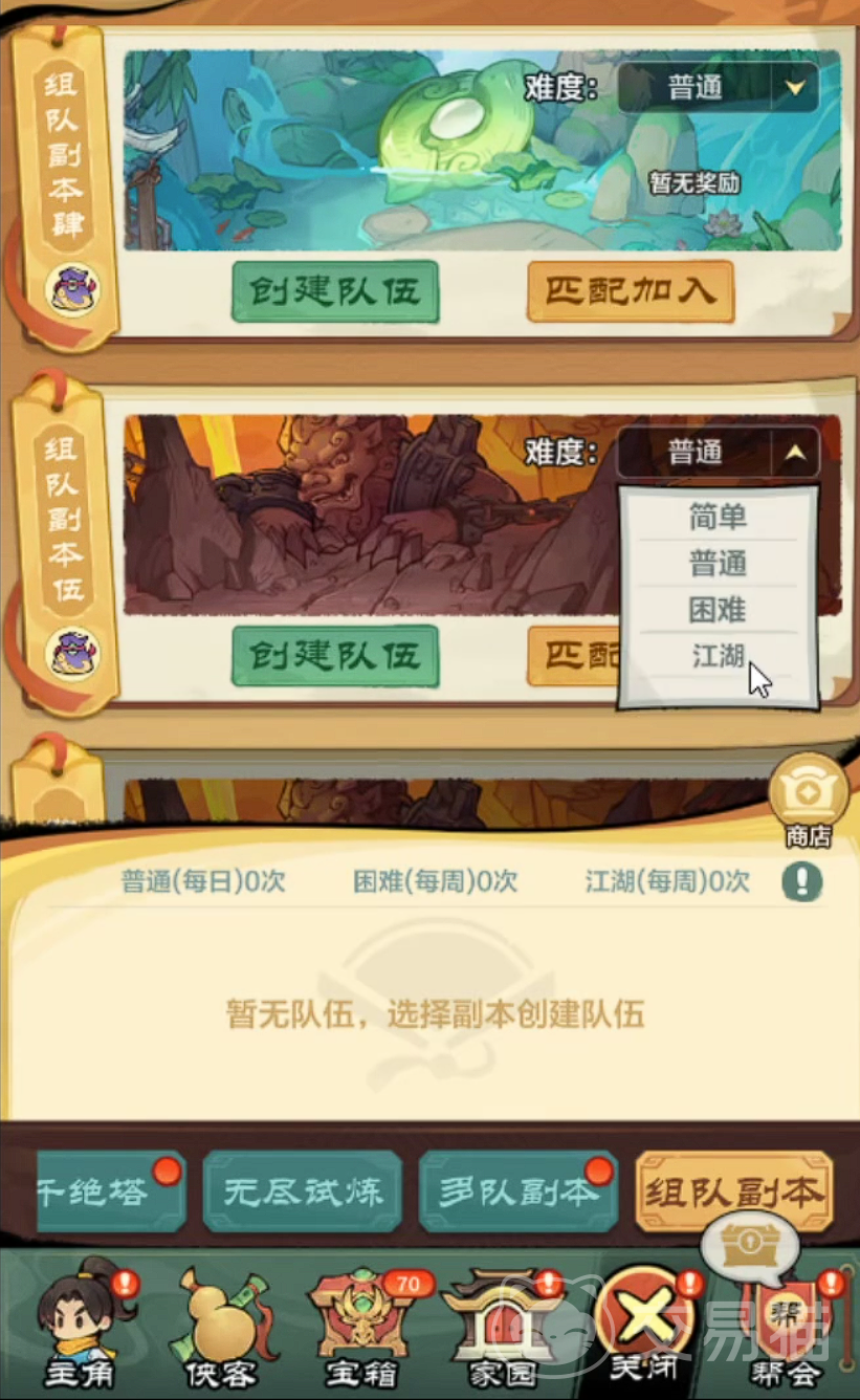 组队副本共分为五关,每关设有简单、普通、困难和江湖四个难度等级,根据玩家开服时间逐步解锁。每个难度等级有两次挑战机会,对应不同奖励资源还是非常丰富的哦!包括宝箱、加速卡、经验和历练值等。而我们要注意需从低到高确保每一关的通关,以最大化收益。