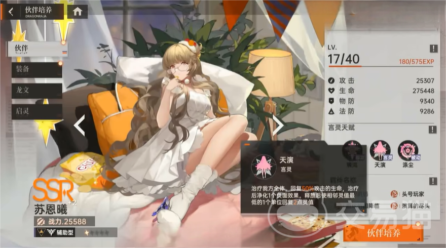 在辅助方面则有着苏恩曦与夏弥两位同为SSR的女性角色,苏恩曦的言灵“天演”可以为我方全部角色回复生命,同时驱散我方角色所受到的一个负面效果,并且回复相邻角色的灵值,使其能够更快的进行言灵的释放。而夏弥则能通过言灵“风王之瞳”来对敌方全体角色造成法术伤害,同时有概率驱散敌方角色身上的增益效果,从而使我方角色能够更好的进行输出。