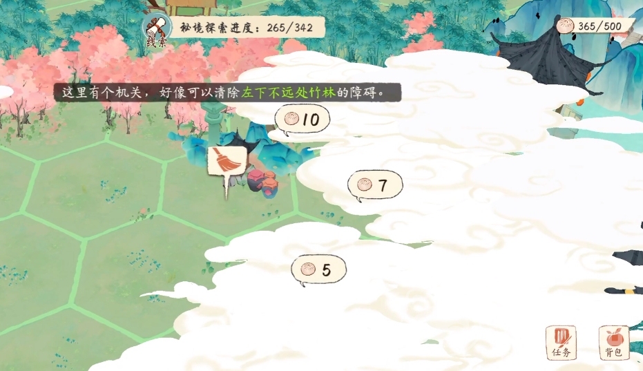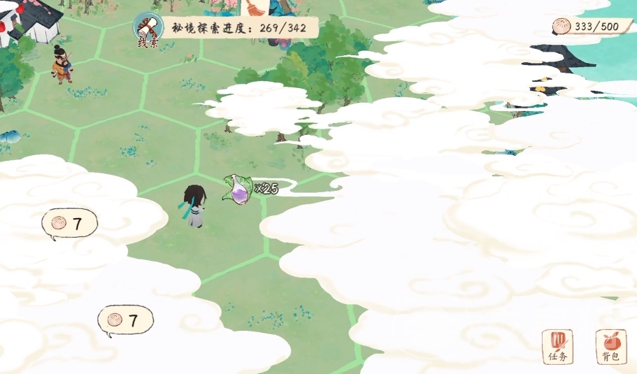 不同的名士触发的秘境会不一样,但是在玩法上大致雷同。进入后整个地图被一层烟雾笼罩着,玩家用【肉包】道具来开路,遇到需要挖掘或者是收集的地块就就行挖掘或者是收集即可。