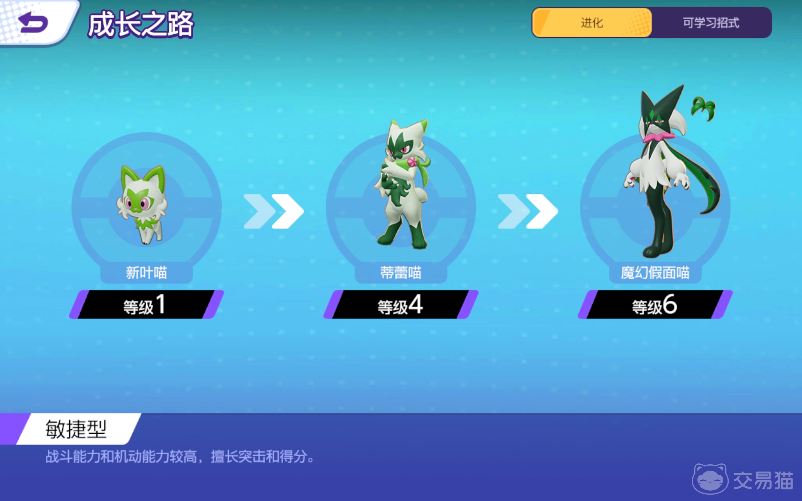 在参与对决的过程中,宝可梦的等级会逐步提升,魔幻假面喵拥有三个形态,分别是新叶喵、蒂蕾喵和最终形态,等级越高战力越强,可解锁的技能就越多。
