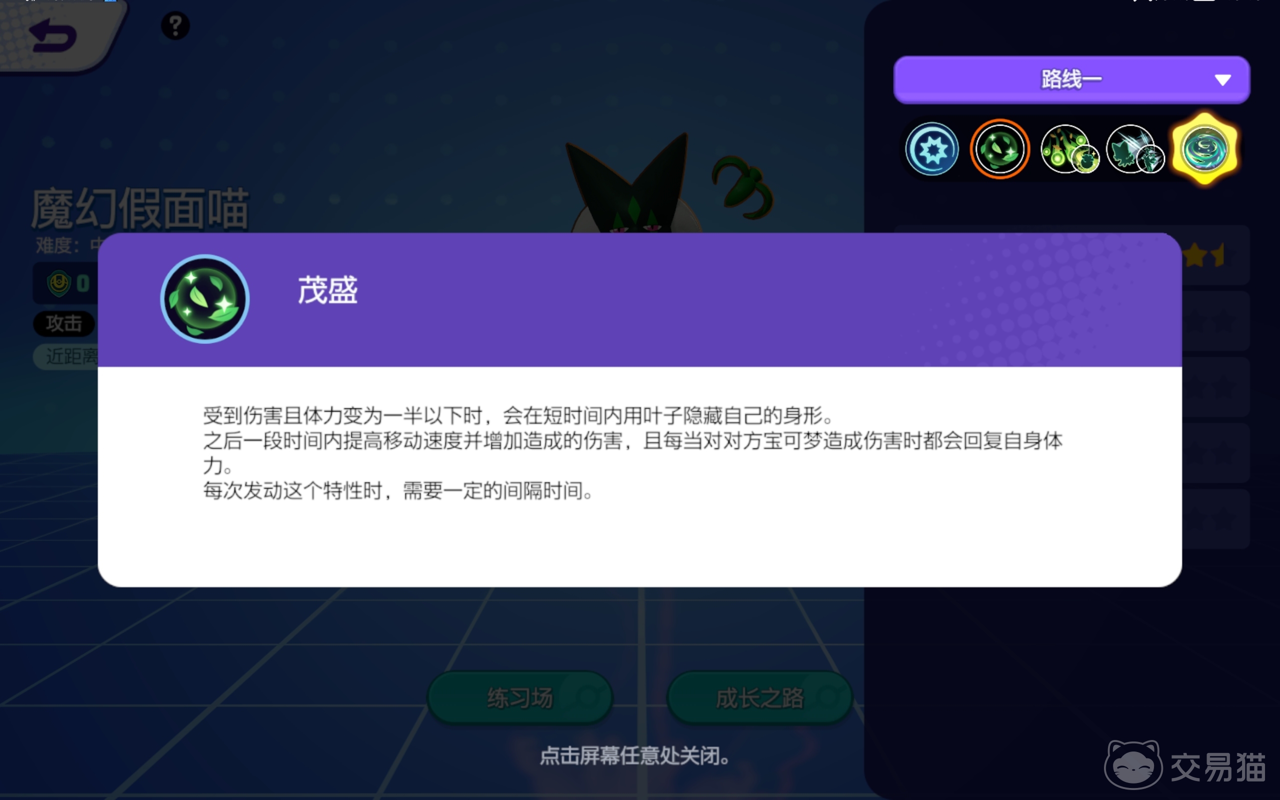 这个英雄拥有四个技能,第一个就是茂盛,它属于是被动特性,当你的宝可梦受到敌人攻击并且体力值不满一半的时候,它就会利用叶子把自己藏起来,期间行动的速度和伤害也会提升,攻击其他对手还能给自己回血。