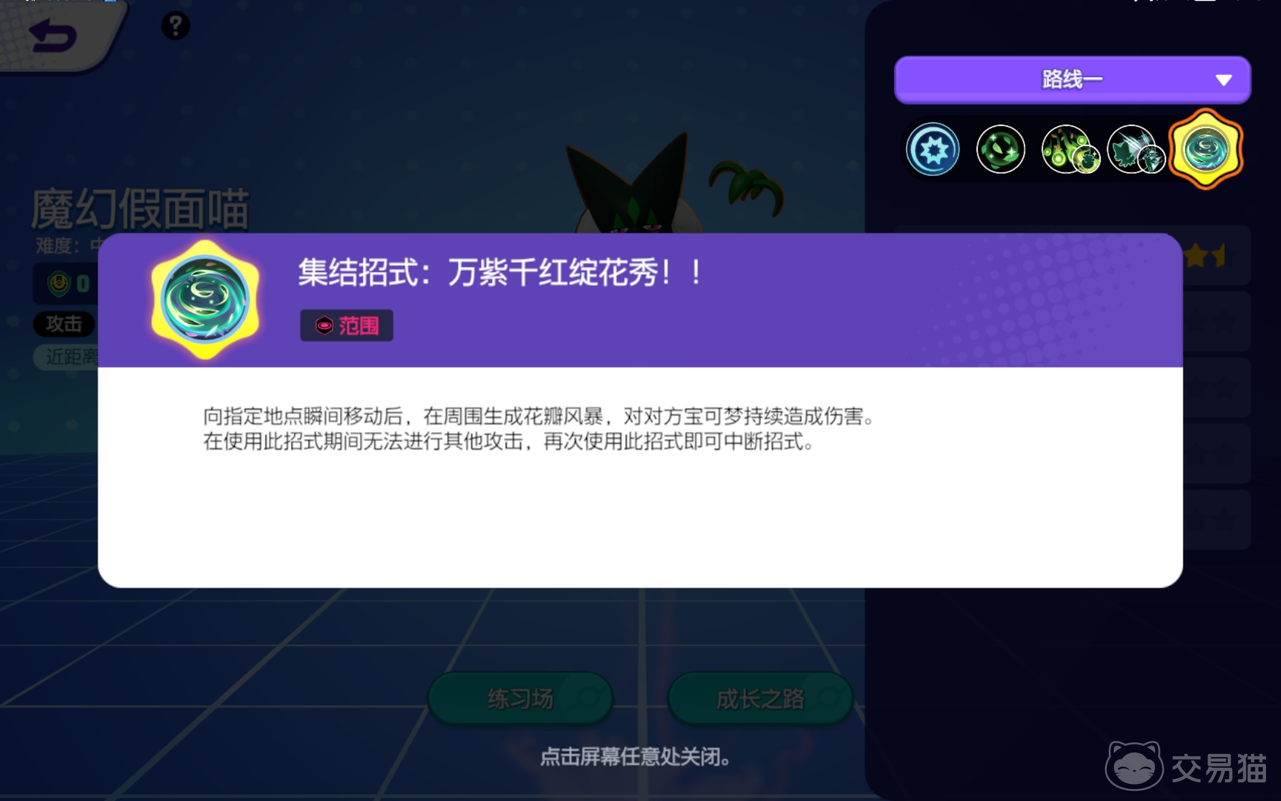 魔幻假面喵的大招是万紫千红绽花秀,大招被释放之后,你可以让角色向目标位置进行瞬移,抵达目标地点之后周围会形成花瓣风暴,给周边的宝可梦造成持续的伤害,大招生效期间,你无法用它去进行其他进攻。