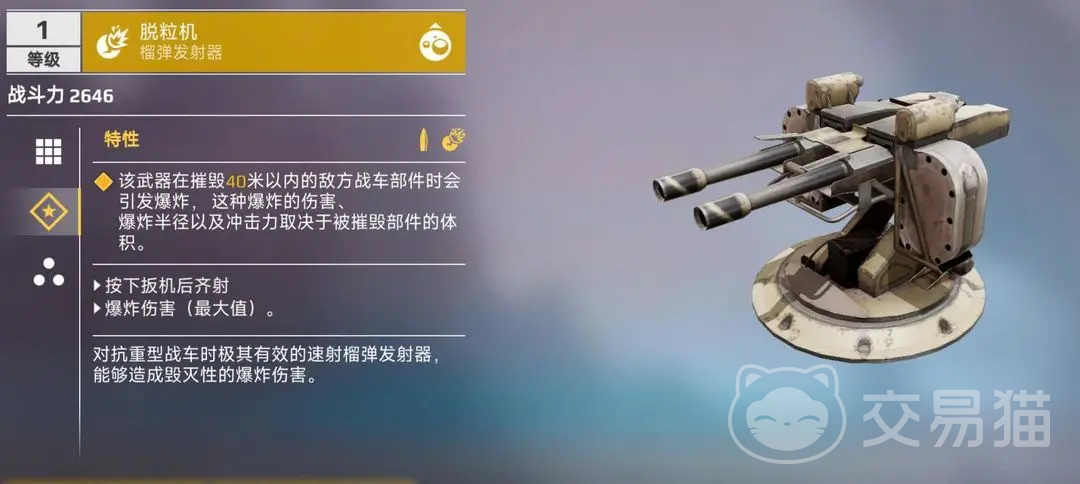 脱粒机是一种榴弹发射器,想必大家都清楚,榴弹发射器这种武器其实是比较具有挑战性的,因为正常情况下此类武器的弹道速度是比较慢的,而且发射角度大时,弹道还受到较大的重力影响,耐久度也相对比较低,但是这种类型的武器往往火力十分强大,可以造成巨大的伤害,一般射击技巧比较精湛的小伙伴比较喜欢。