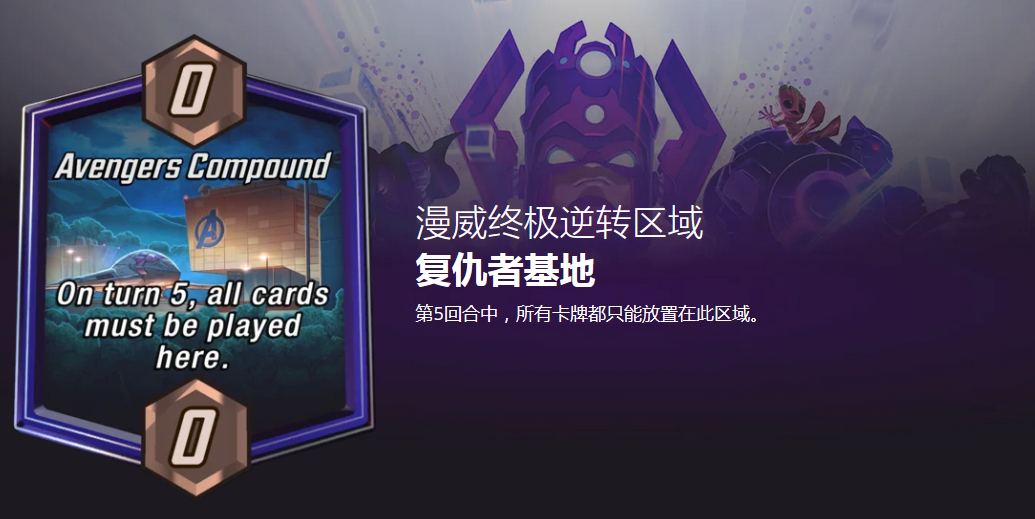 复仇者基地出现之后,该区域的效果就成为,第5回合中,所有卡牌都只能放置在此区域。相比于其他的区域,其实这个效果大家很容易就能理解,而且应对起来也比较简单,只限定在第五回合生效。在该回合所有的卡牌都只能放到复仇者基地所在的区域中。相信大家都非常清楚,场上是分为三个不同的区域,那么该如何将这一效果利用起来,还需要有合适的卡牌进行配合应对。