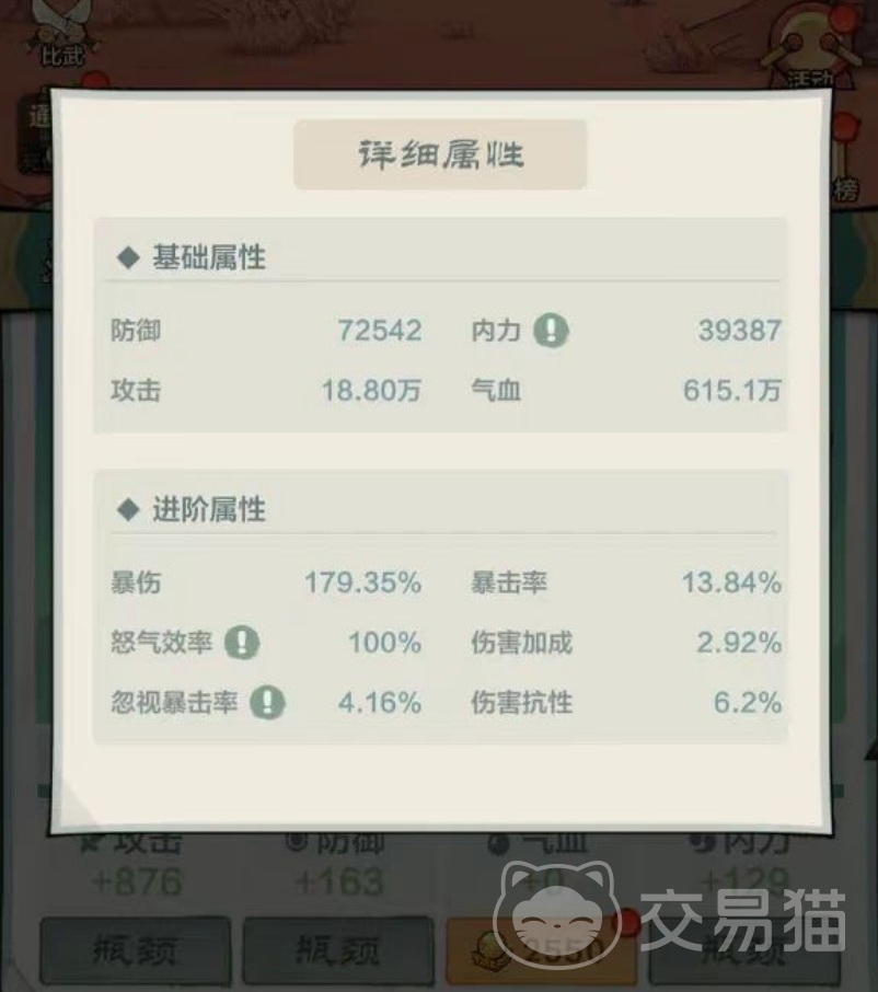 游戏里的属性大致可以分成两类,分别是基础属性和进阶属性。先说基础属性。角色总共有四个基础属性,分别是攻击,防御,气血以及内力。攻击和防御都很好理解,就是角色的伤害和减伤。而气血则可以看做是角色血量,气血值越高,角色血量越厚。