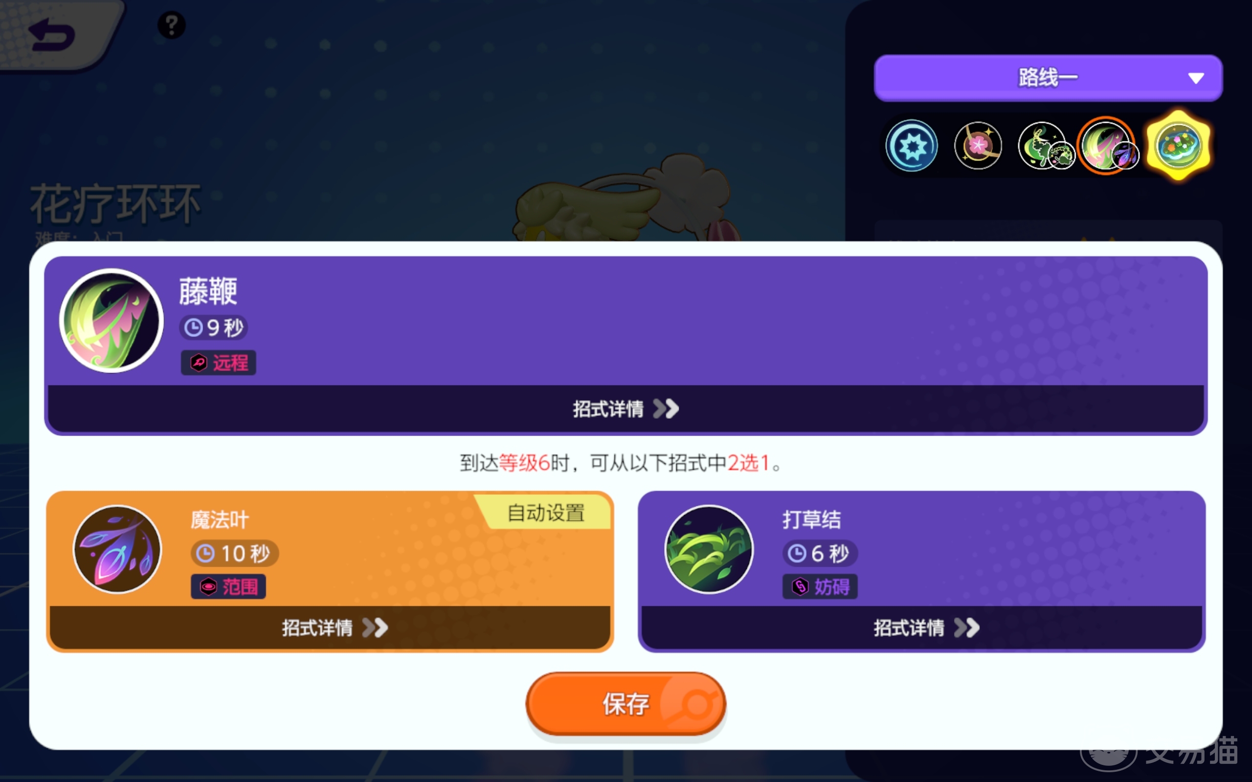 释放藤鞭这个招式后,不仅能给攻击对手还能降低它的移速,宝可梦达到7级后,还能进化这一招,一共有两个方向,分别是魔法叶和打草结,第一个技能每秒可以射出去3片叶子,要是附着在队友身上去施法,攻击范围还会变大;另一招是发射藤蔓,被绑住的宝可梦无法行动。