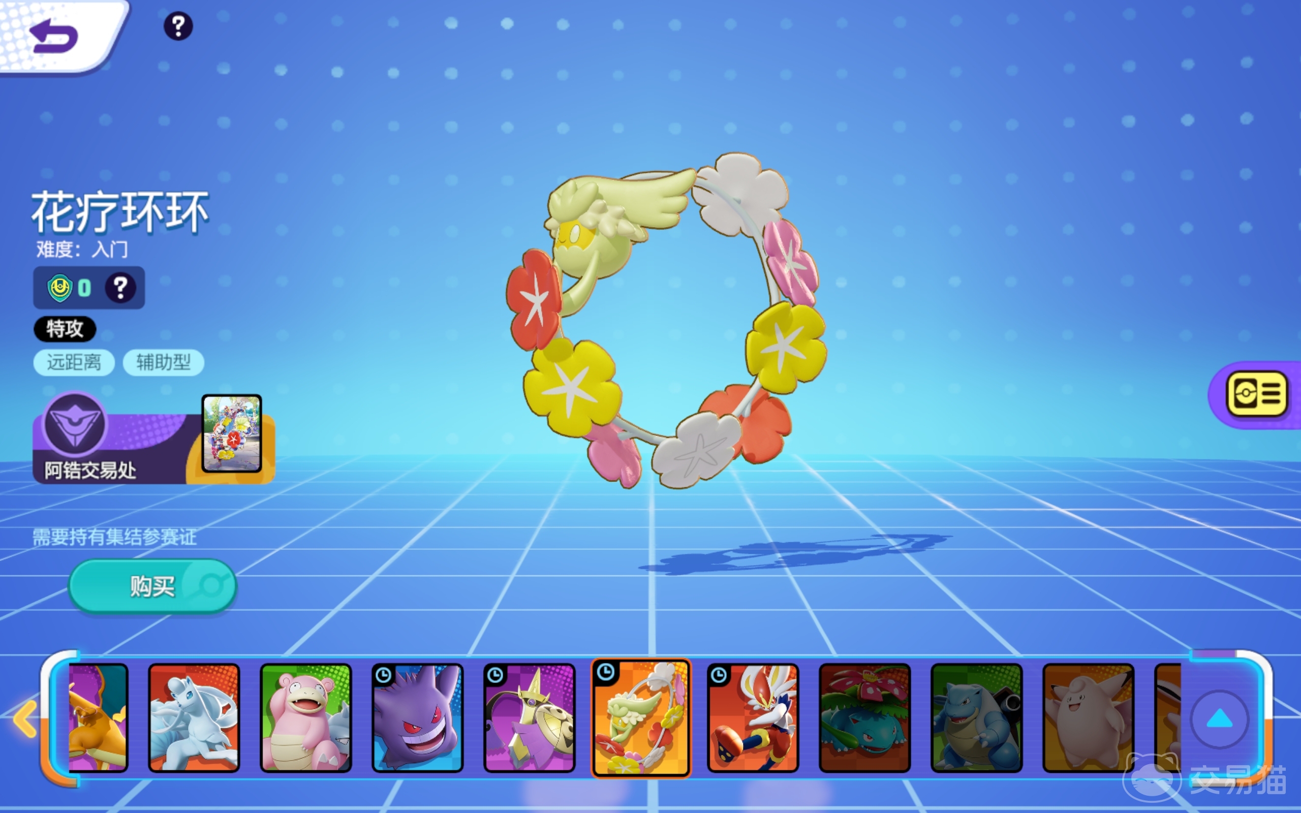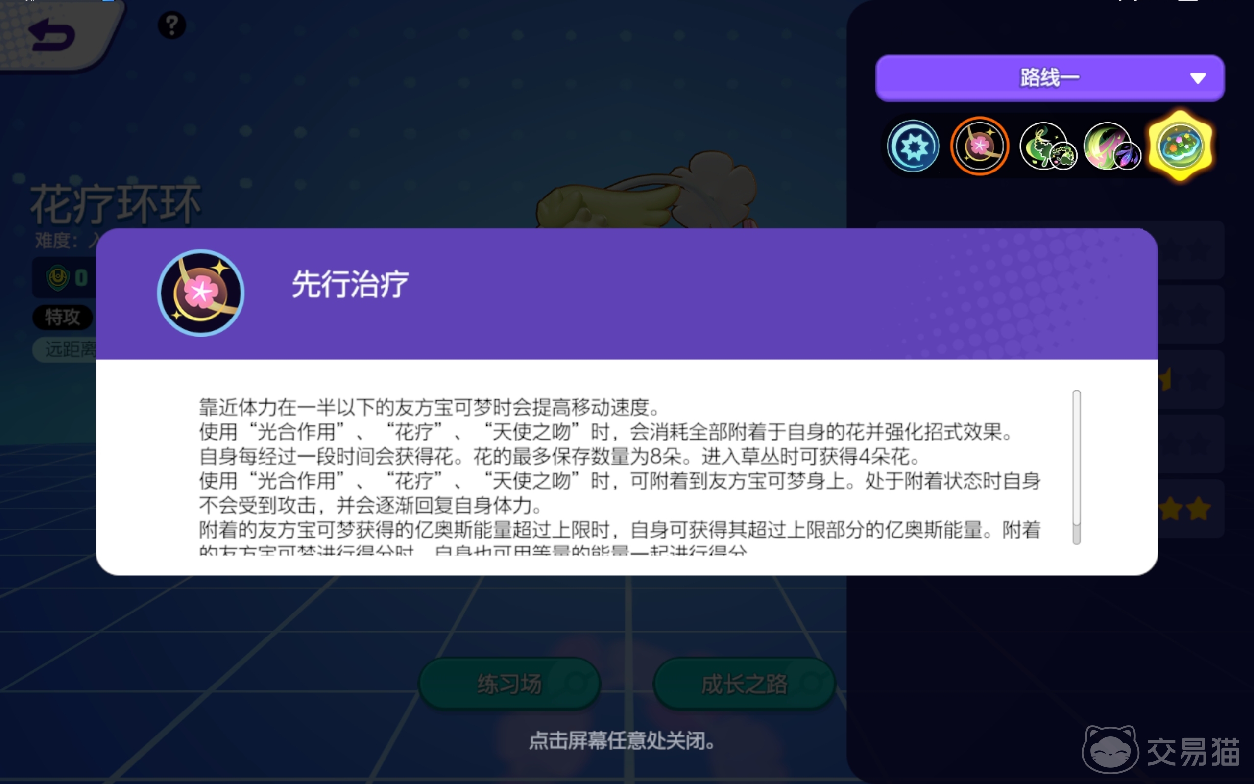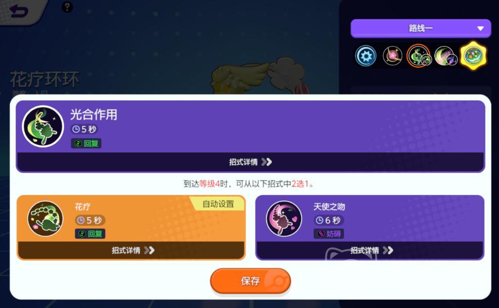 想要获取这个宝可梦,只需点击购买选项即可,大家还可以去阿锆交易处选购它的专属皮肤,让其在战斗中更加亮眼。花疗环环的第一招先行治疗的效果很好,你只要靠近体力值不满一半的宝可梦,它的移速就会升高,你还能附着在队友身上,提升它储存能量的上限。