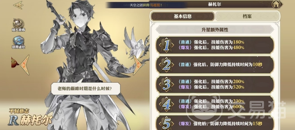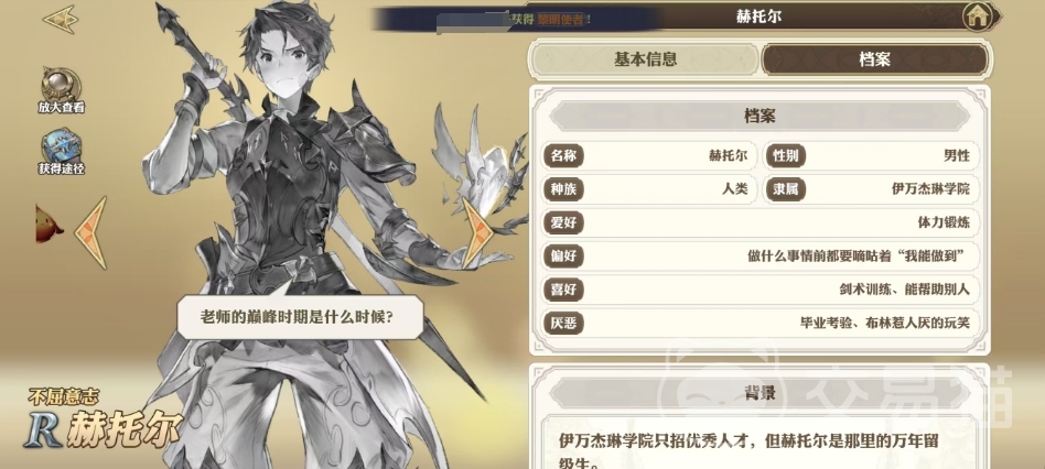 在游戏里面赫托尔以火属性而出名,作为一位男性人类,他隶属于伊万杰琳学院,与角色库伊有着深厚的友情,赫托尔热爱体力锻炼,将强健的体魄视为自己追求剑术巅峰的基石,他总是在做任何事情之前嘀咕着“我能做到”,这不仅是他对自己的鼓励,也是对未来的坚定承诺。