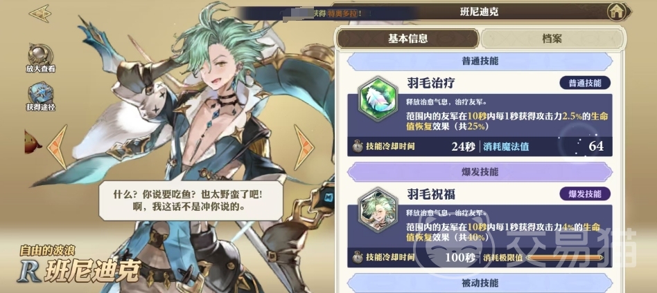 羽毛治疗是他的普通技能,其冷却时间为24秒,消耗魔法值为64,当释放羽毛治疗时,会散发出一股治愈的气息,为周围的友军带来恢复效果,在羽毛治疗的影响范围内,友军将在10秒内,每1秒获得相当于攻击力2.5%的生命值恢复效果,总共可恢复25%的生命值,这一技能不仅能够有效地支援前线的队友,还能在关键时刻为团队提供持久的战斗力,通过巧妙运用羽毛治疗,玩家可以在战斗中保持队伍的稳定状态,所以班尼迪克作为一个辅助绝对是称职的。