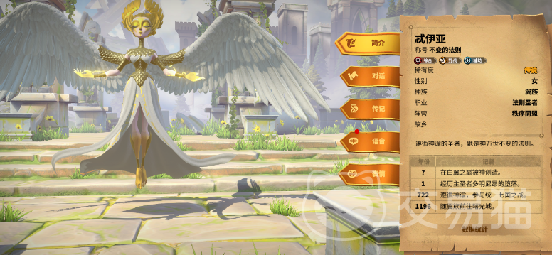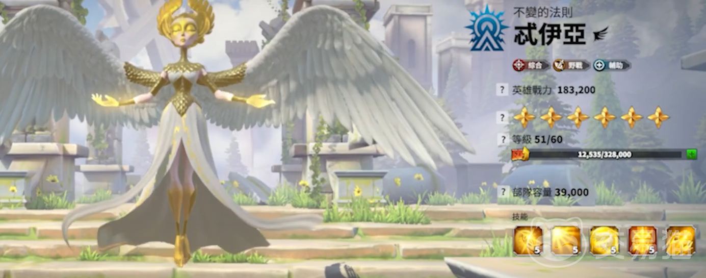 被称为“金天使”,很多时候都是作为副将登场的一个英雄,堪称万用副将,技能效果适配各种输出型的英雄。基本上是绑定飞行单位,技能有不错的伤害,并且在与敌人对战的时候可以提升队伍的生存空间,觉醒后还可以附近单位挂护盾,所以投资金天使会有不错的收益。