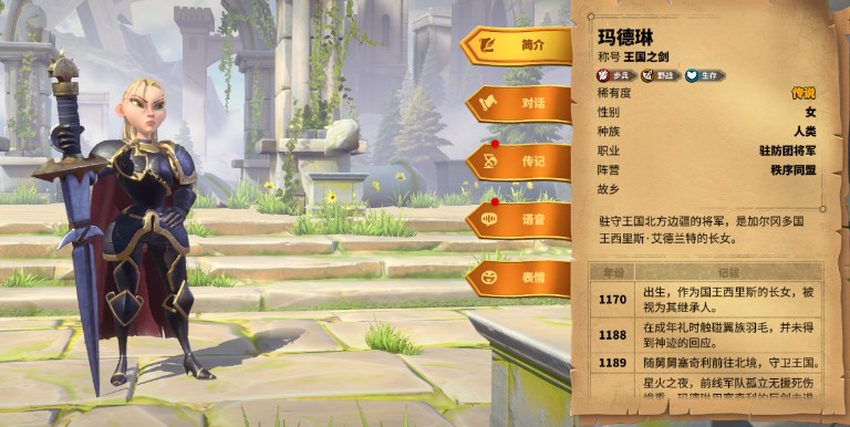 很好用的步兵英雄,不管是付费还是零氪都是要拿到手的。玛德琳的怒气技可以获得锐利效果,4秒内物攻提升的同时获得1个持续4秒为己方部队吸收伤害的护盾,可以起到很好的保护作用,在联盟pvp里也经常被拿来放在前排承受巨量伤害。被动加部队容量上限,提升野战物理伤害。提升部队反击伤害与率领部队的血量。怒气技获得的护盾被打破的时候对周围最多3个部队造成一次物伤,觉醒之后还会附加抵抗效果,使得在接下来4秒内受伤降低。