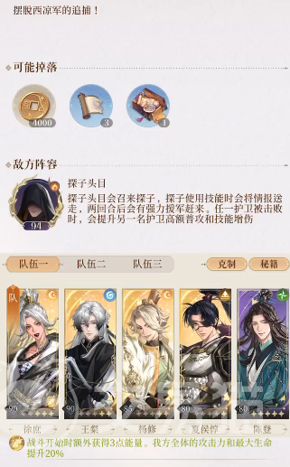 在打法上注意前期第一个回合尽量将防御拉满,让徐庶在后面的回合能开大招后面杨修就能将强化的探子打死。前期一定要在四回合之前保存好整体的战斗力,防御和奶量拉扯争取到输出开大秒这样能够快速的过关。