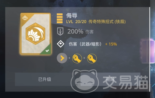 关于侮辱这个花招的具体属性,小编就直接帮大家贴在文章中了。此花招是传奇铁扇特内布里斯之瞥的专属花招,可以使得自身的伤害提升至200%,并且使武器伤害提升15%。从这里小伙伴们不难看出这个花招的存在可以使得铁扇本身的攻击性变强,并且这把武器是有一个专属被动技能的,施展技能后可以一定比例的提升伤害,共叠加50层,与这个花招相配合所打出来的伤害还是非常可观的。
