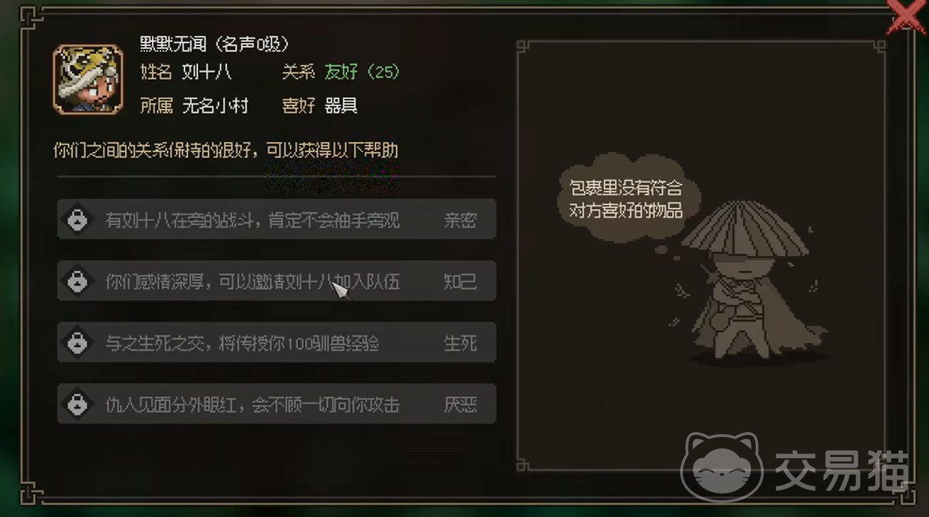 注意避开负面选项,选择前三个选项有助于快速提升好感度。等好感度达到90后,使用灵芝作为礼物,能够显著提升好感度,直至满值,就可以让猎户加入自己的队伍,直接教你学会兽语。