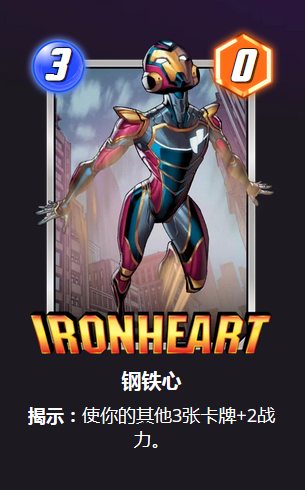 钢铁心是一张三费零战力的卡,他的效果是揭示,使我方的其他3张卡牌+2战力,钢铁心的效果其实在一定程度上和钢铁侠有些相似。但是钢铁心属于揭示,而钢铁侠是持续,这两者在发动方面就有很大的区别。当然效果也不相同,钢铁心是三张卡牌加2战力,这也是很有用的一张牌。