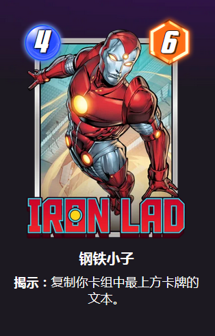 钢铁小子的效果是揭示,复制我方卡组中最上方卡牌的文本。每一张卡都有自己的属性,除了费用和战力之外,还有一段文本,描述的是这张卡牌的具体效果,而钢铁小子的能力就是将这一段文本效果复制过来。而且有一定的选择性,那就是我方卡组最上方的卡牌,这样在阵容搭配的时候就很有针对性了,钢铁小子属于四费六战力。