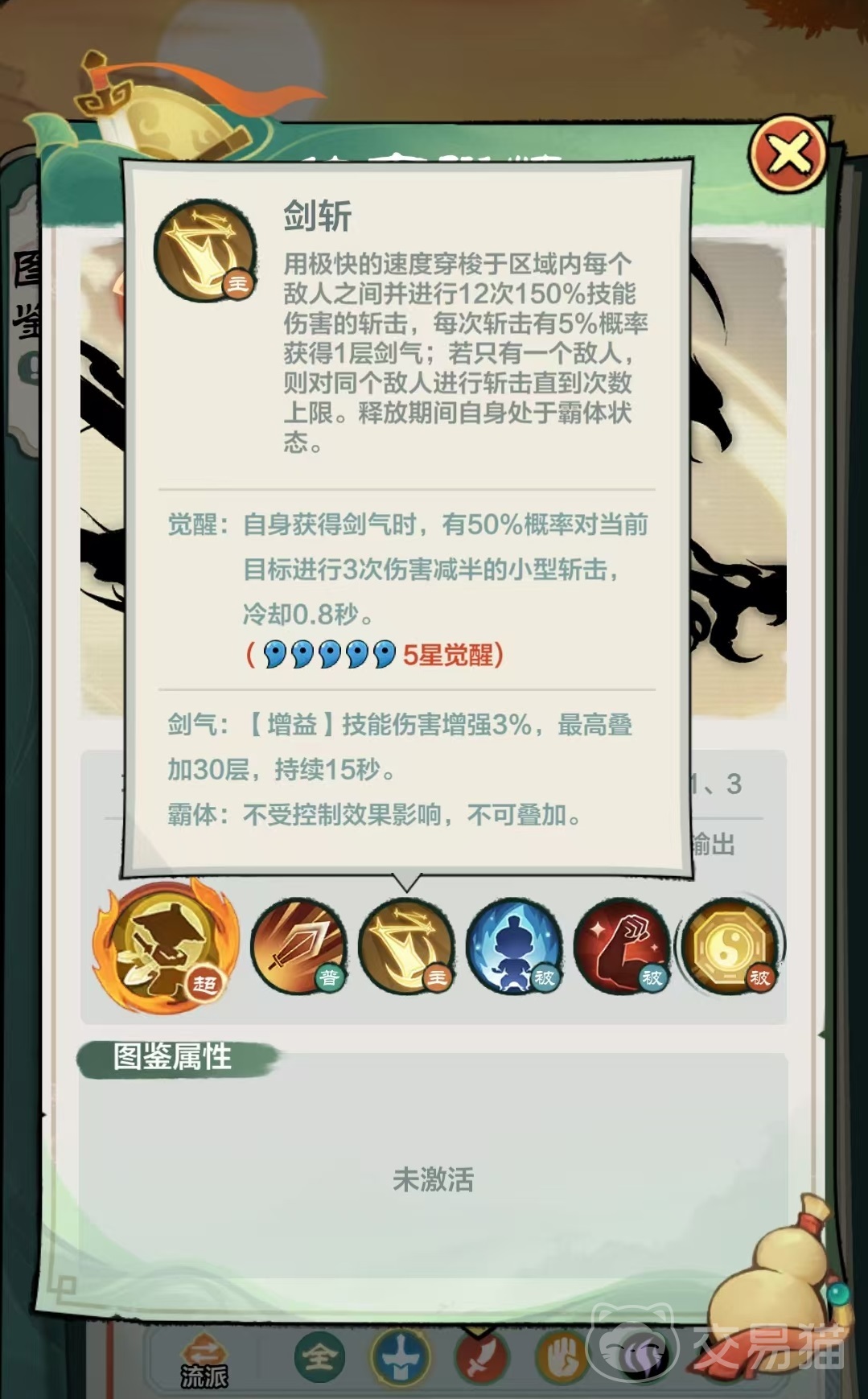 这是一个非常好用的群体输出技能,而且对单体也有着很出色的伤害表现,一个主动技能就涵盖了群体和单体两种伤害类型,所以实力非常强悍。在觉醒之后,自身获得剑气,有50%概率对当前目标进行三次伤害减半的小型斩击,这样使主动技能伤害进一步提升。剑气是属于增益效果,能增强3%技能伤害,最多叠加到30层。普通技能是剑刺,单体攻击类型,对目标造成伤害后有概率获得一层剑气,每隔10秒钟,自身就能获得15%最大血量的护体罡气。
