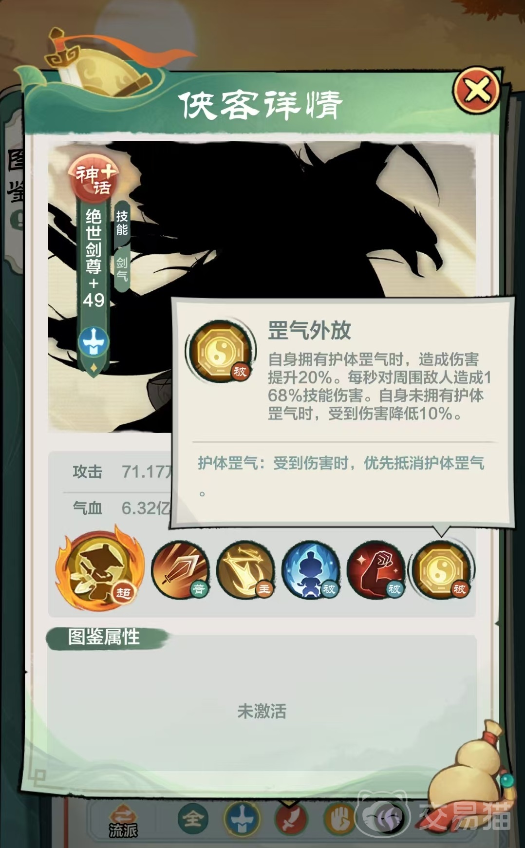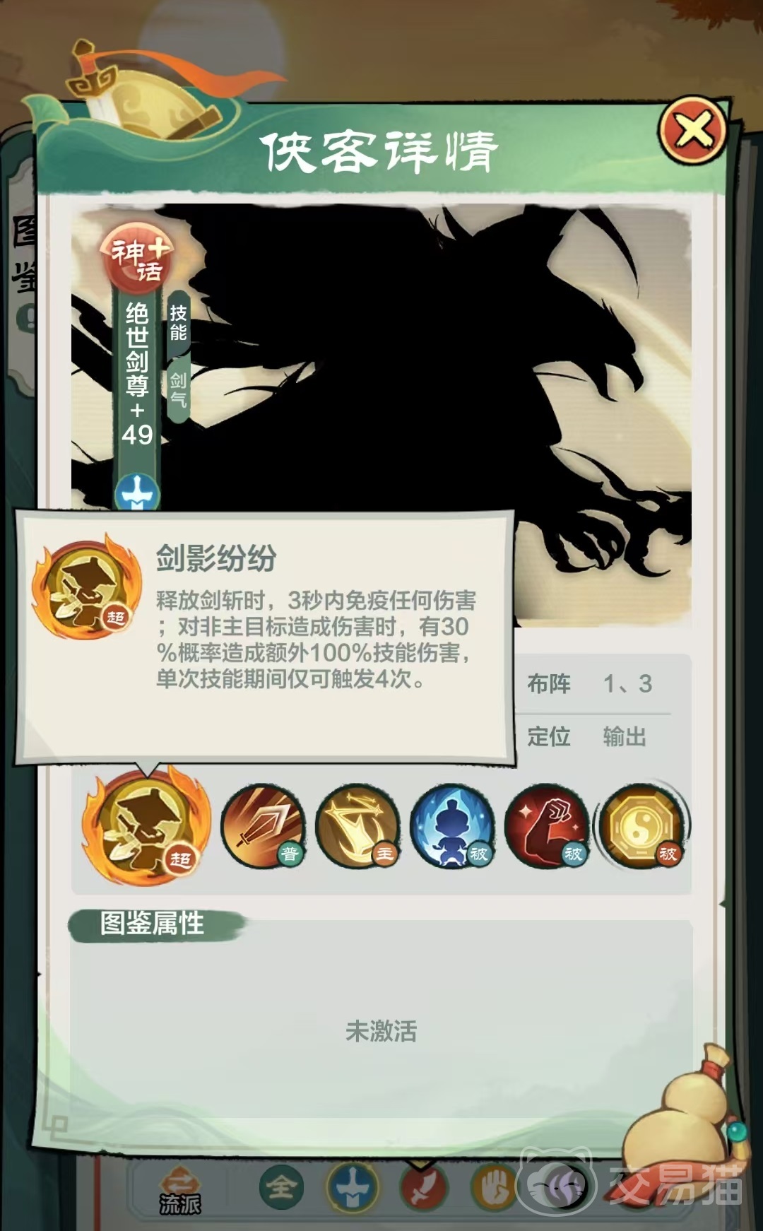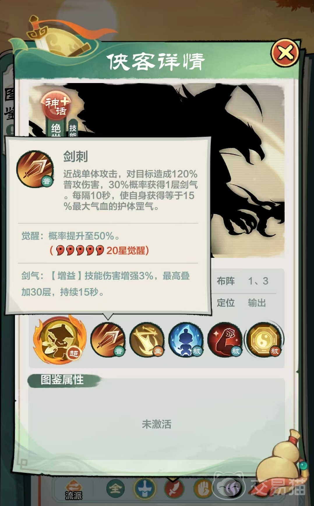 最后一个被动罡气外放,当自身拥有护体罡气时,造成伤害提升20%。每秒对周围敌人造成168%技能伤害。自身如果没有护体罡气时,受到伤害降低10%,在受到伤害时将会优先抵消护体罡气,大家可以理解为护盾。如果大家喜欢使用剑客职业,那么绝世剑尊绝对是最值得培养的一名侠客,它可以布置在阵容的一、三两个位置,属于前排输出类型。