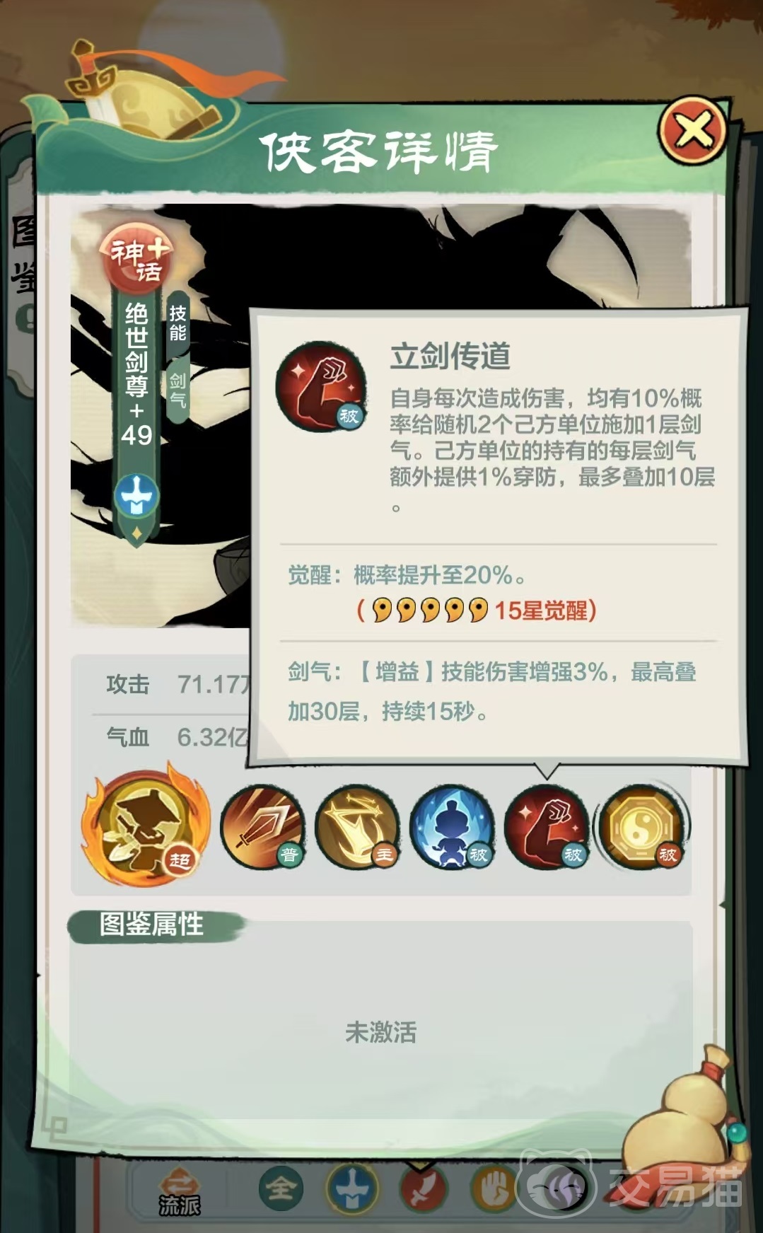 另外还有三个被动技能,第1个必胜心境,进入战斗中之后,自身内力与气血提升15%,对所有侠客均具有流派克制效果。这一个被动非常关键,直接奠定了绝世剑尊在输出位置上的绝对强势,因为他对不同流派均有克制效果,不用考虑到对手的阵容了。第2个被动立剑传道,自身每次造成伤害,都有10%几率,以随机两个己方单位施加一层剑气,己方单位持有的电剑气额外提升1%防穿效果,最多叠加10层。这样剑气就不再只对自己生效,对另外两个友军也有技能伤害加强,只是最多只能叠加到10层。