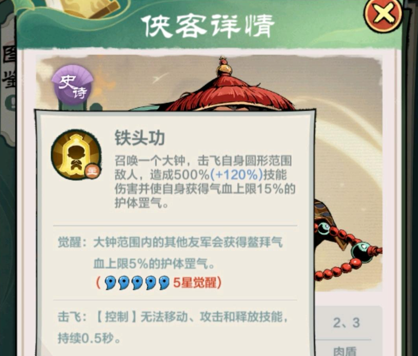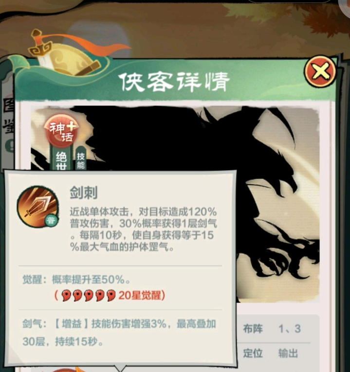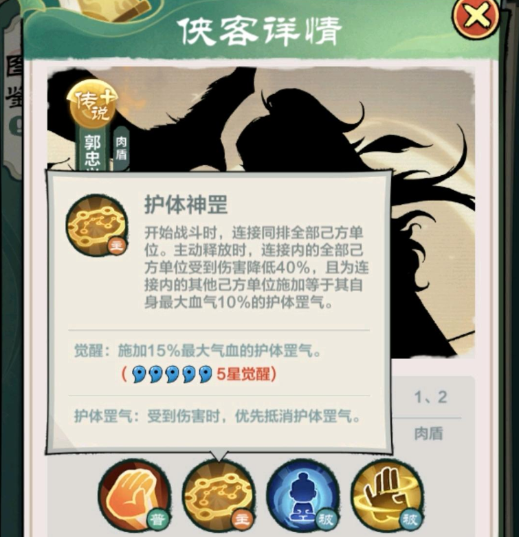 这是一个传说级别的英雄,是一个带有辅助功能的侠客。战斗的时候可以使用护体神罡,可以连接自己的所有队伍。并使得所有人受到的伤害都降低,还可以帮助己方单位施加生命值更多的护体罡气,所以这个英雄很百搭。就算大家其他角色搭配得不好,亦可靠他力挽狂澜。