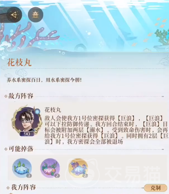 Boss花枝丸的等级为90级,是水属性,技能特性是使玩家队伍1号位的队长获得巨浪debuff,叠加上这个debuff的角色。在回合结束的时候会附上两层溺水debuff,受到致命伤的时候,会给1号位队长再挂上巨浪,同时拥有两层巨浪,玩家的角色全部强制退场,视为挑战失败。