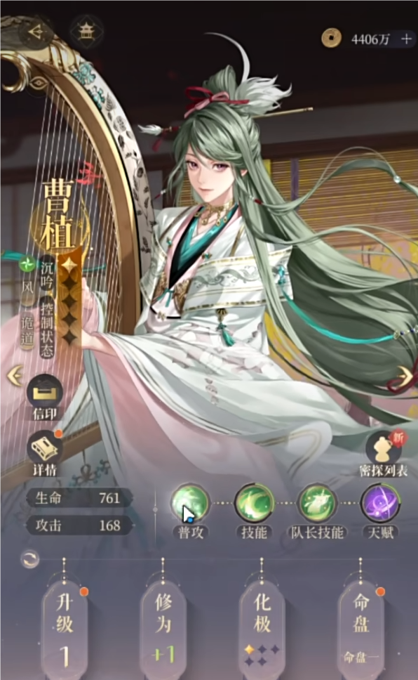 首先在文章的第一部分给大家直接总结一下曹植的能力,她的技能沉吟-使敌方技能无效,功能是让对方的大招失效,意思就是对手开大对我们不会造成任何伤害以及减益效果,在8-20之前的敌人大部分都可以生效,然而大多高难BOSS免疫沉吟所以无法发挥。技能倍率给的比元老密探修香还要低,无法兼任输出,但对于新手来说是一个不错的选择,可以和鲁肃哥一样练个50级左右陪你闯荡主线。