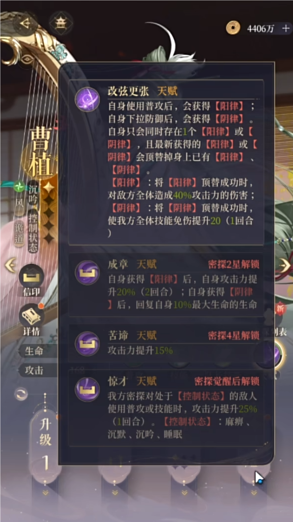 如果想要培养曹植的玩家,命盘推荐用洒落赋韵、音义既远,洒落必备,可以透过操作让曹植的技能变四灯和BOSS对轴;音义则是将沉吟效果转群体,面对一群怪集体放大绝时好用(例如新手期常会卡住的集体黑山军、暴躁船夫等等)。开两格就好了不建议投入太多资源给他。曹植天赋“攻击时得到阳律”、“防御时得到阴律”,每次顶替阴阳律时都有不同效果。配合命盘洒落和音义,如果敌方为四灯,曹植四回合一循环的操作为「A↓A↑」。如果敌方为三灯,可以配合陈登点灯或是小乔沉默将敌人拉成四灯来对轴。官方直接写明「沉吟、沉默、麻痺、睡眠」是同一组的控制效果,这四个会一起免疫/不免疫,所以小乔是曹植的好队友。从9-13王允之后的BOSS几乎都免疫沉吟,逃掉的课总有一天要还,该练的卡还是得练。不过你永远不知道官方会不会新活动放一只超强BOSS但可以被沉吟,有没有曹植将会是天堂地狱的差别。如果求稳的玩家还是得拥有一只,以备不时之需。