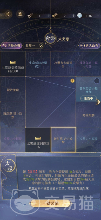 命盘方面最为推荐的是禁止防御,攻击力大幅度和时间规划这两个也对见,但是攻击力大幅度略大于时间规划,其余的可以选择攻击力中小幅度提升和生命值低时提升攻击力这些和提升攻击力相关的命盘,因为太史慈非常吃攻击力。