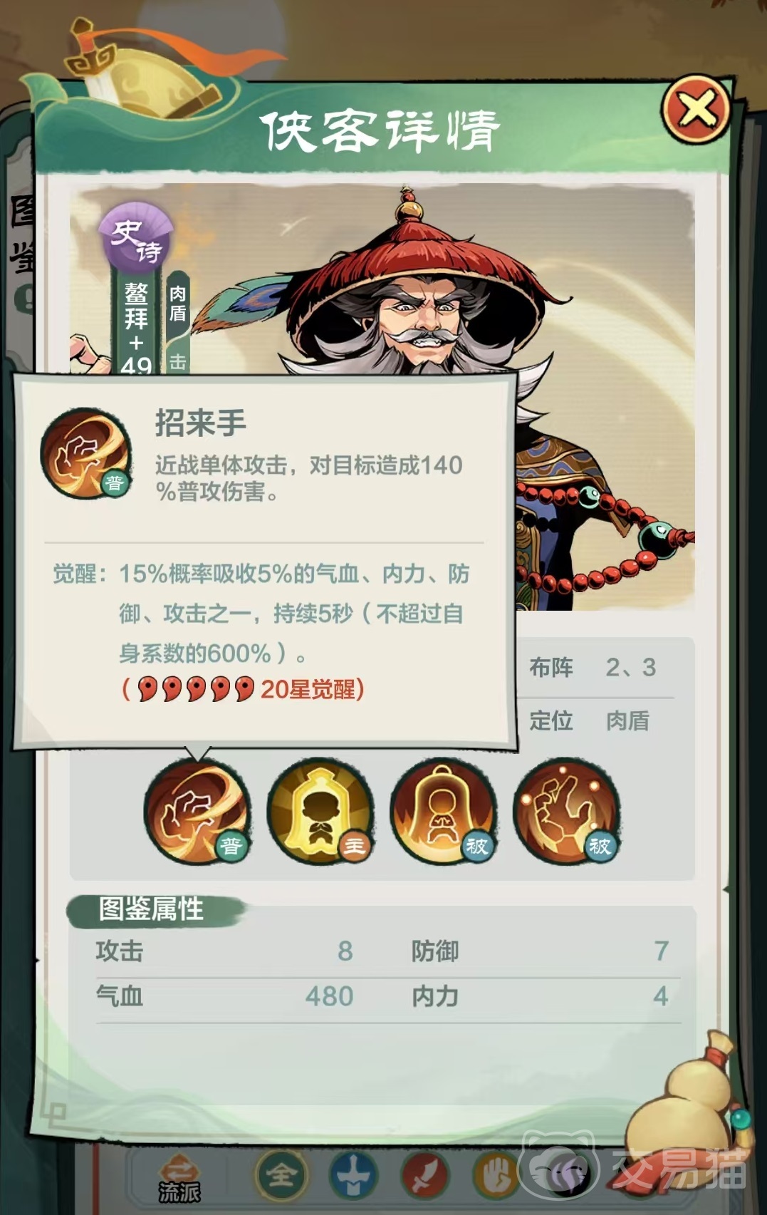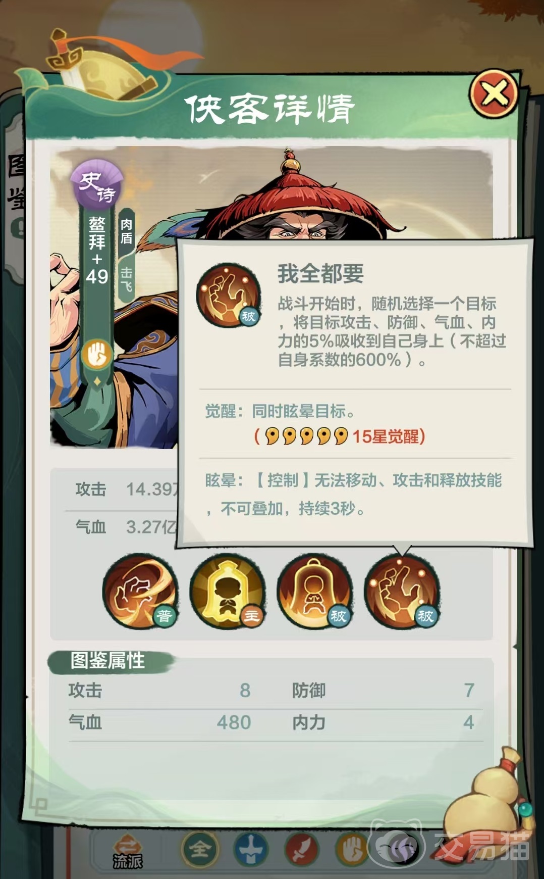 另外两个被动技能是金刚腿和我全都要。金刚腿能够使受到的伤害降低,觉醒之后能降低25%,初始怒气提升100,怒气上限降低100。我全都要,在战斗开始时,随机选择一个敌方目标,将目标攻击、防御、气血、内力的5%吸收到自己身上,觉醒之后同时附加眩晕效果。通过这些技能效果,大家不难看出,鳌拜不仅自身作为肉盾非常硬,更是有保护队友的效果,而且觉醒之后的效果也非常出色。
