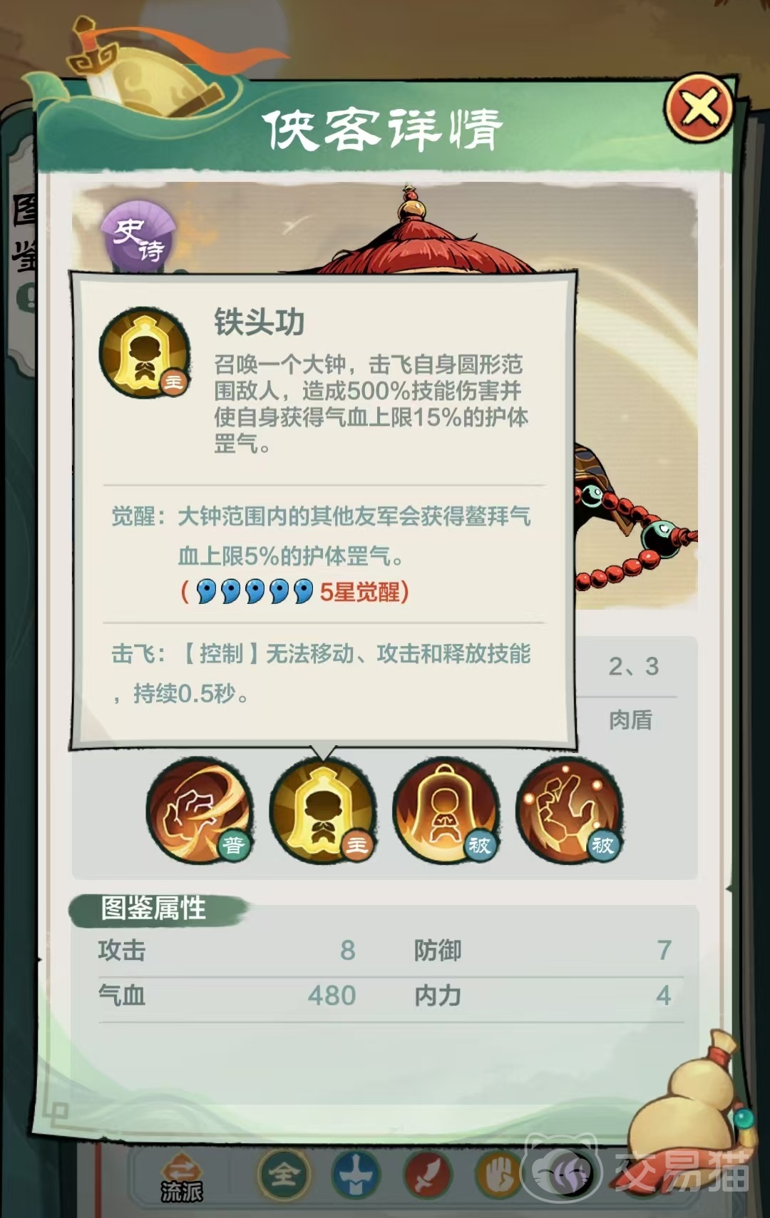 鳌拜是属于肉盾类型的侠客,他的普攻技能属于近战单体伤害,能够对目标造成140%普攻伤害,觉醒之后有15%概率,吸收5%气血、内力、防御、攻击这4项属性之一,持续5秒钟。主要技能铁头功,召唤出一个大钟,将自身圆形范围内的敌人击飞,造成500%技能伤害,并使自身获得15%血量上限的护体罡气。在觉醒之后,大钟范围内的其他友军也会获得鳌拜15%血量上限的护体罡气。
