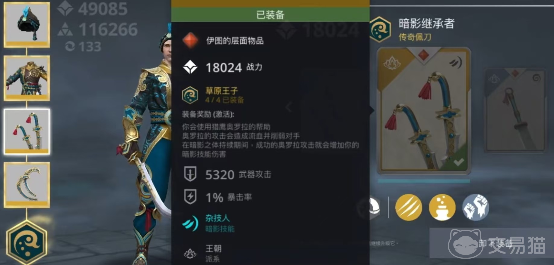 草原王子是一套由传奇装备组成的套装,它的套装效果是获得猎鹰奥罗拉的帮助,奥罗拉的攻击会造成流血并削弱对手,在暗影之体持续期间,奥罗拉的成功攻击可以增加我方暗影技能伤害。这是一套属于王朝派系的装备,头盔选择的是鹰峰,非常有印度王子的风格,带有的暗影技能是爆裂。衣服选择的是影纶传奇盔甲,也同样非常华丽,上面有大量装饰品,带有陀螺传暗影技能。