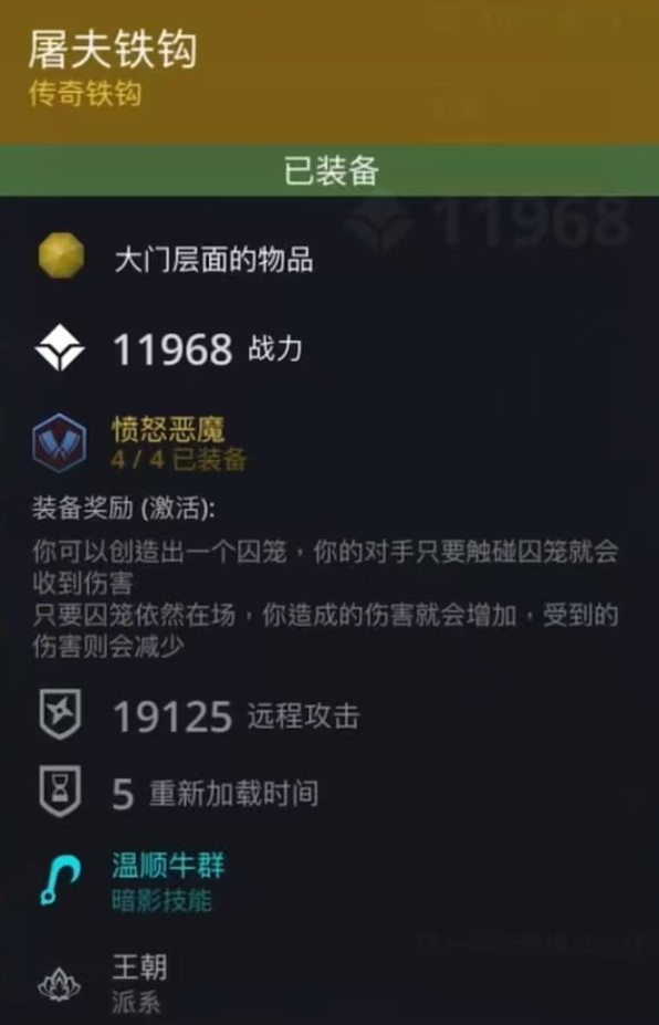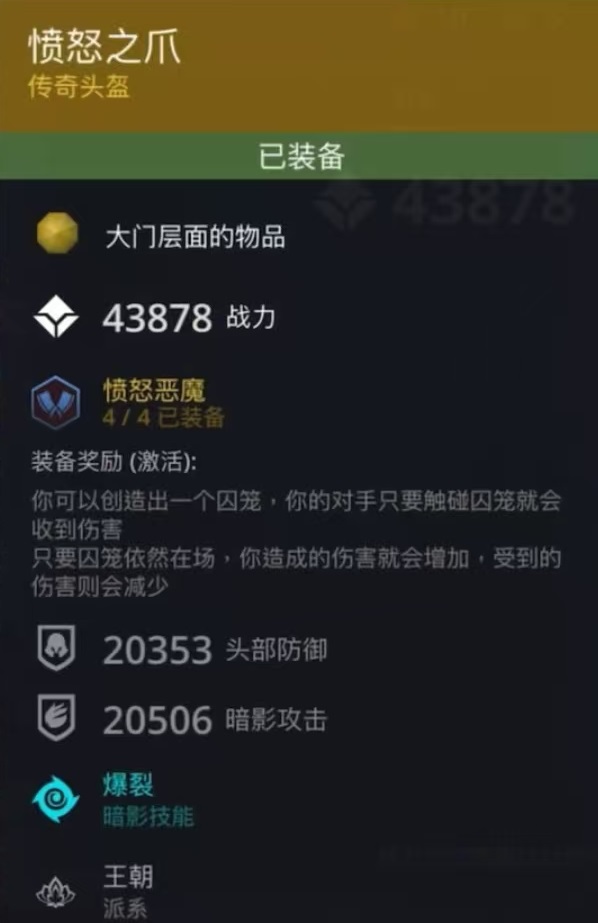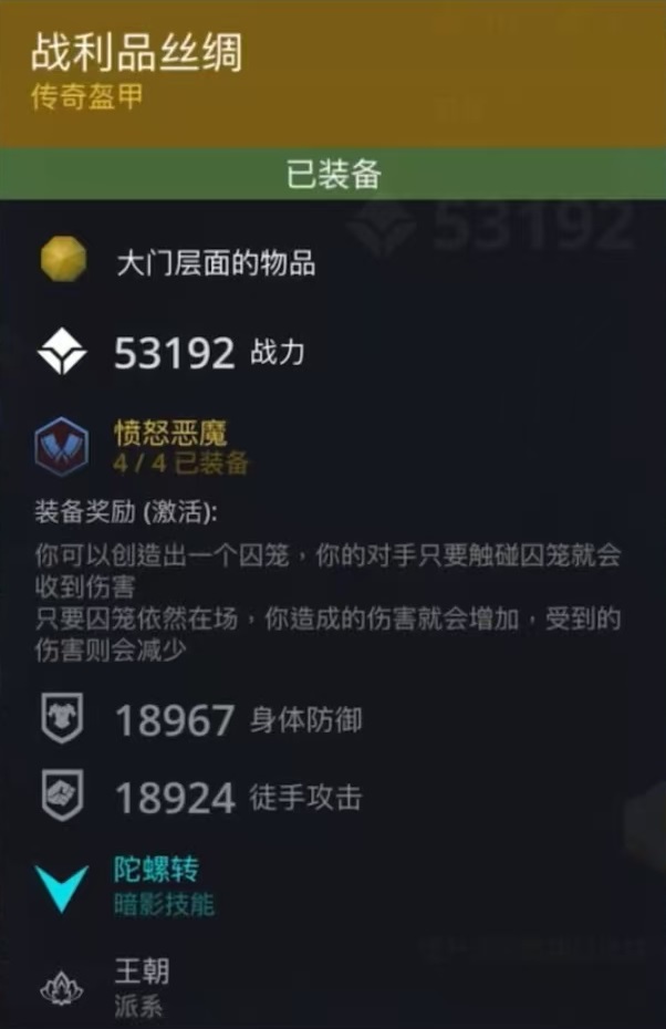 当大家在集齐了4件装备之后,就会获得装备奖励效果。能够在战斗中创造出一个囚笼,对手只要触碰到囚笼就会受到伤害,只要囚笼依然在场上,那么玩家造成的伤害就会增加,受到伤害则会减少。也就是创造出囚笼之后,可以有效地限制对方移动,同时利用带来的加成获得场上的优势。这套装备的头盔是愤怒之爪,它所带有的暗影技能是爆裂,盔甲是战利品丝绸,带有的暗影技能是陀螺传。
