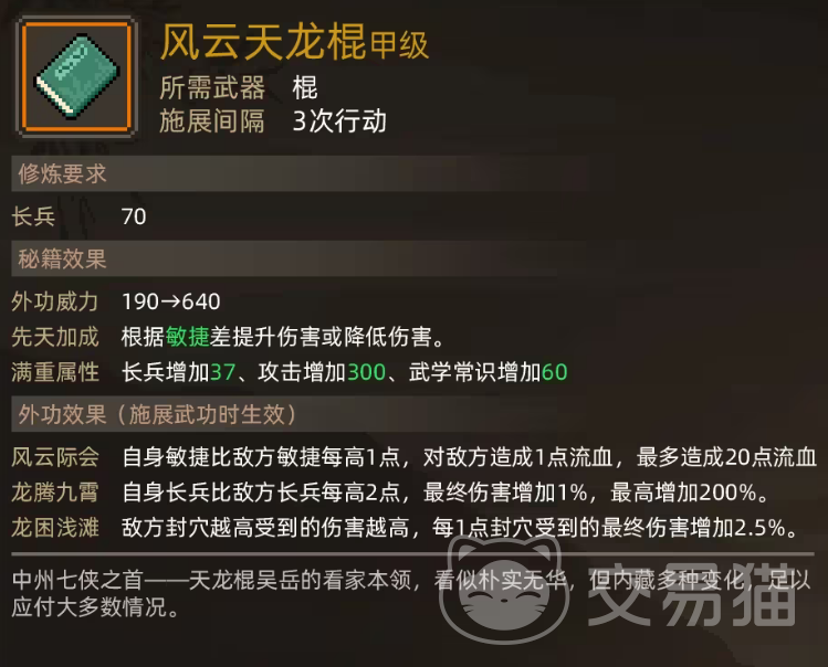 在龙脉宝藏任务中击败玄尘,便能得到这门象征力量与速度合一的棍法。