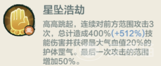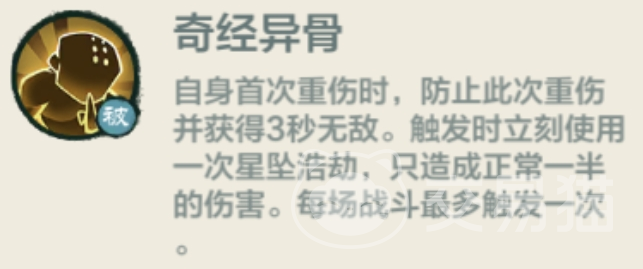 被动技,首次受到重伤时,可以规避掉这次重伤并且获得3秒无敌,同时立刻打出一半伤害的星坠浩劫。这拳师的防反打法的关键技能,残血情况下有着极强的爆发。